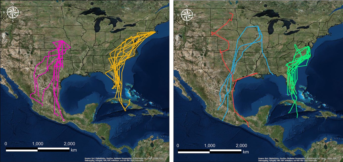 Each line represents the most probable fall migration route for Grasshopper Sparrows from breeding populations in Kansas (purple, n = 8) and Massachusetts (orange, n = 10; left panel) and North Dakota (red, n = 1), Wisconsin (blue, n = 4), and Maryland (green, n = 10; right panel). Grasshopper Sparrows from the Midwest almost exclusively overwintered in Texas and Mexico, whereas sparrows from the eastern U.S. overwintered in Florida or the Caribbean.