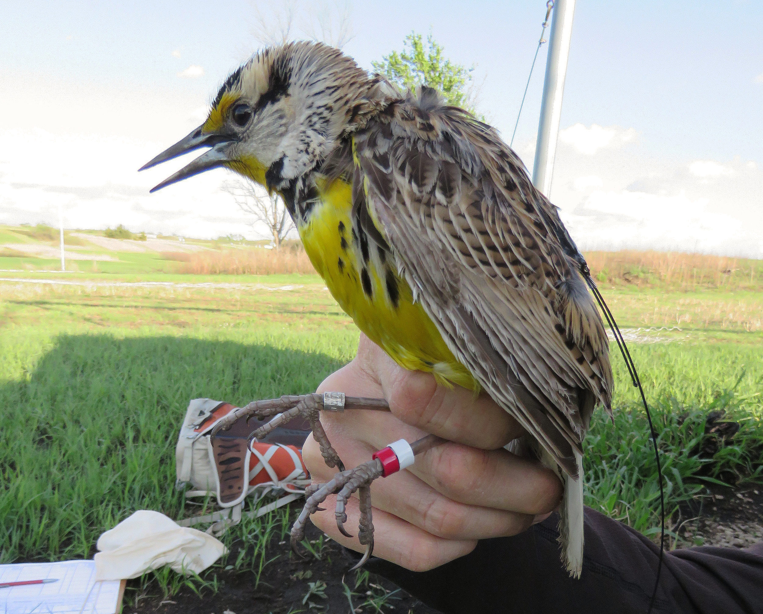 While that sounds difficult enough, the really hard part was re-capturing the very same Grasshopper Sparrows one year later to remove those geolocators and download their data! Eastern Meadowlark backpacks, thankfully, transmitted data through satellites. The team was able to retrieve location data on 34 Grasshopper Sparrows and five Eastern Meadowlarks.