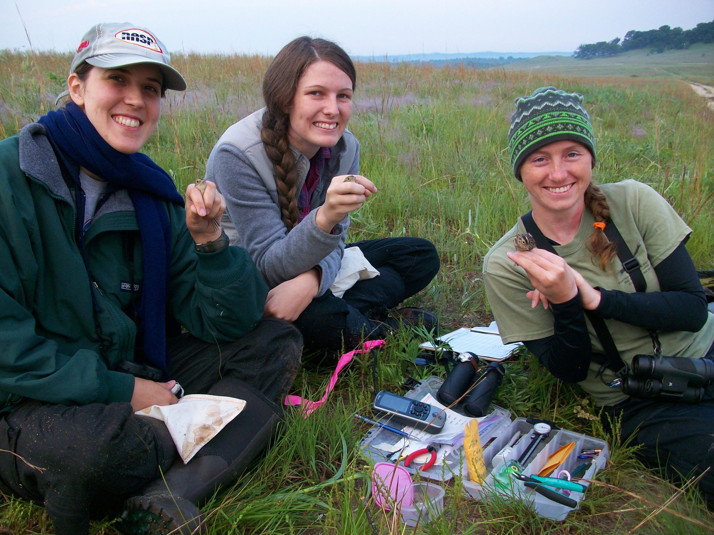 Pictured left to right: Inez Hein, Dana Timms, and Alison Nevins. Each of them are holding a Grasshopper Sparrow at Fort McCoy, Wisconsin. / © Sue Vos.