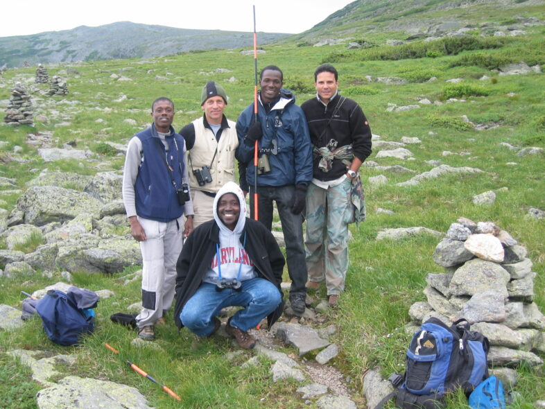 Anderson Jean (holding mist net pole in back) in Mt. Washington’s Alpine Garden during a VCE exchange in July of 2008, with (counterclockwise from front) Abdel Abellard, Enold Louis Jean, Chris Rimmer, and Robert Ortiz. Photo by Kent McFarland.