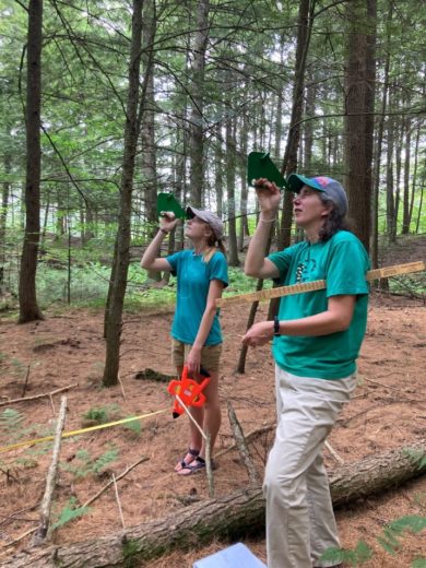 VCE EcoAmeriCorp member Abbie Castriotta and Becky Proulx using tangent height gauges to calculate the height of a tree.