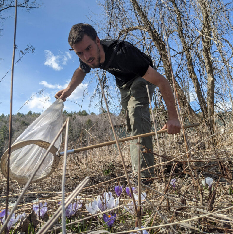 VCE bee biologist Spencer Hardy attempts to net a bee during one of many surveys. © Jacqueline Huettenmoser