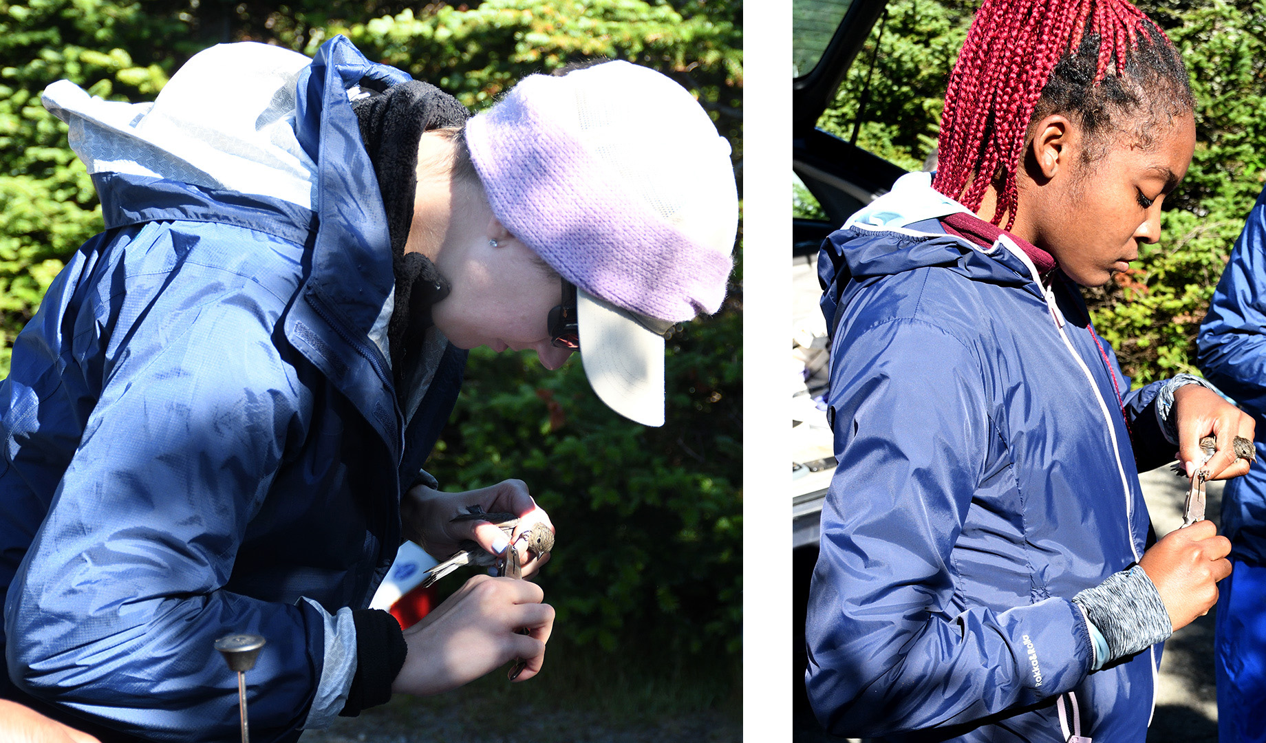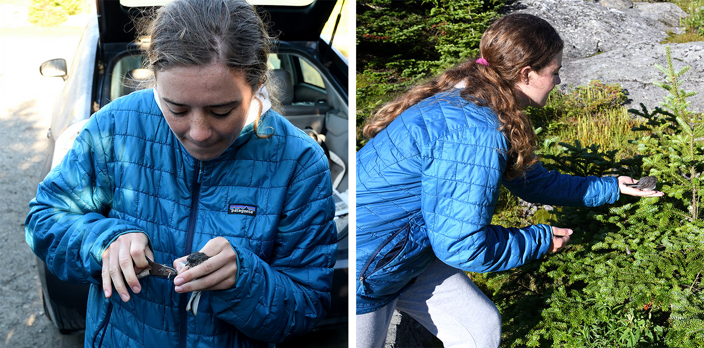 VCE summer interns Madison Sayers (left) and Latrice Hodges (right) banding juvenile Dark-eyed (Slate-colored) Juncos on Mt. Mansfield, 3 August 2022. © Michael Sargent