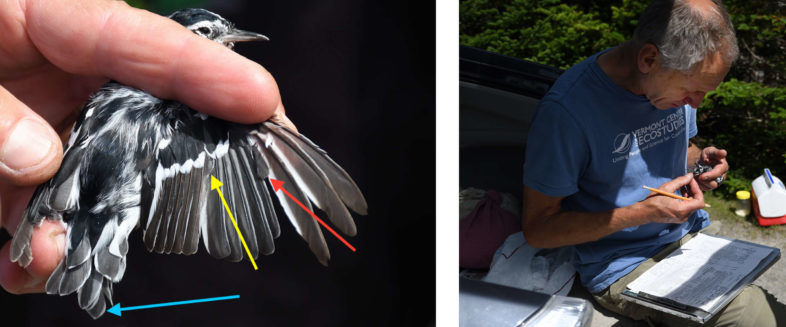 Left: an adult male Black-and-white Warbler in heavy wing molt. The 9 primaries molt sequentially and distally (away from the body), while replacement of the six secondaries begins later and proceeds proximally (towards the body). On this bird, note its three faded and worn outer primaries (#7–9), a barely detectable gap where primary #6 (fourth from outside) is missing, its 1/3-grown primary #5 (red arrow), and fresh and darker primaries #4 (nearly full length) through #1 (the innermost and first to molt). Only 5 of its six secondaries remain, and #1 is <1/3 grown (yellow arrow). The bird’s 12 tail feathers, which molt centrfugally (inside to out) on each side, and much more rapidly than the wings, are all between 1/3—1/2 full-grown (blue arrow). The entire molt will last 5-6 weeks, after which a fresh complement of flight feathers will carry this bird to its wintering grounds in the extreme southeastern U.S., Caribbean, Central or northern South America. Right: recording the progression of molt on a “molt card”, on which each individual flight feather is assigned a score from 0—5, according to its stage of growth (0=old, 5=new, fully-grown). © Michael Sargent