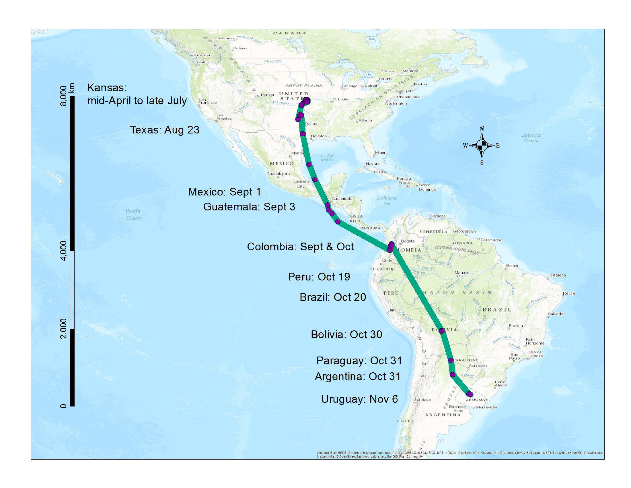 The fall 2016 migration route (>10,000 km, so far) of an Upland Sandpiper that bred in Kansas. This Upland Sandpiper was fitted with a solar-powered satellite tag in April, 2016 at Konza Prairie, Kansas. Since leaving Kansas in July, she has visited nine additional countries on her southward journey. Map created in ArcGIS.
