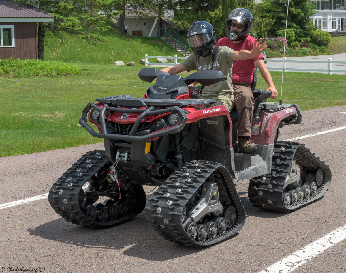 Not VCE’s typical mode of transport up Mt. Mansfield: Chris Rimmer and Noel Dodge prepare to ascend the toll road (currently closed to vehicles) on a WCAX ATV. Look out Evel Knievel! © Charles Gangas