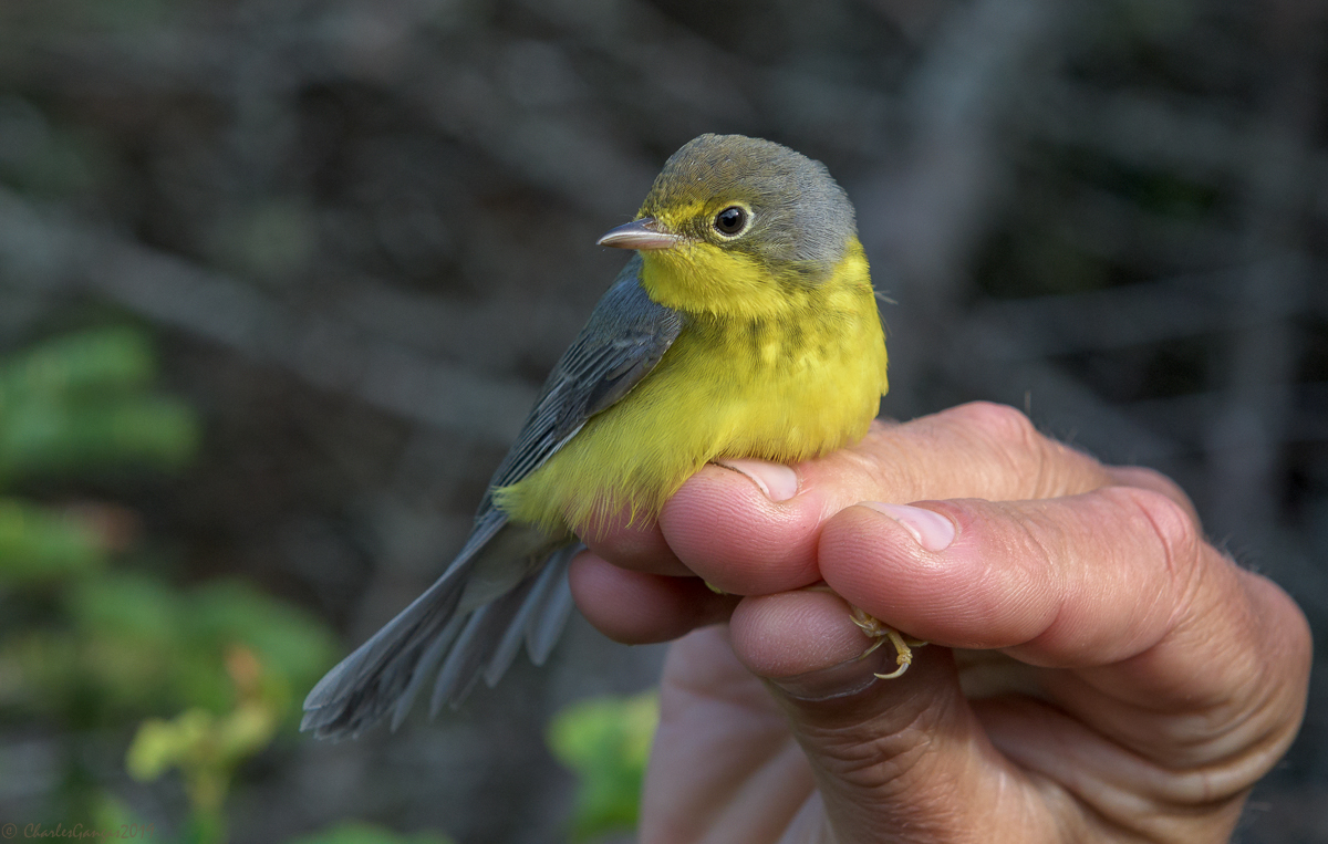 A female Canada Warbler banded on Mansfield (OK, not the same individual we banded on 5 June, but very similar in appearance and a much better photo than our iPhones managed to capture). © Charles Gangas