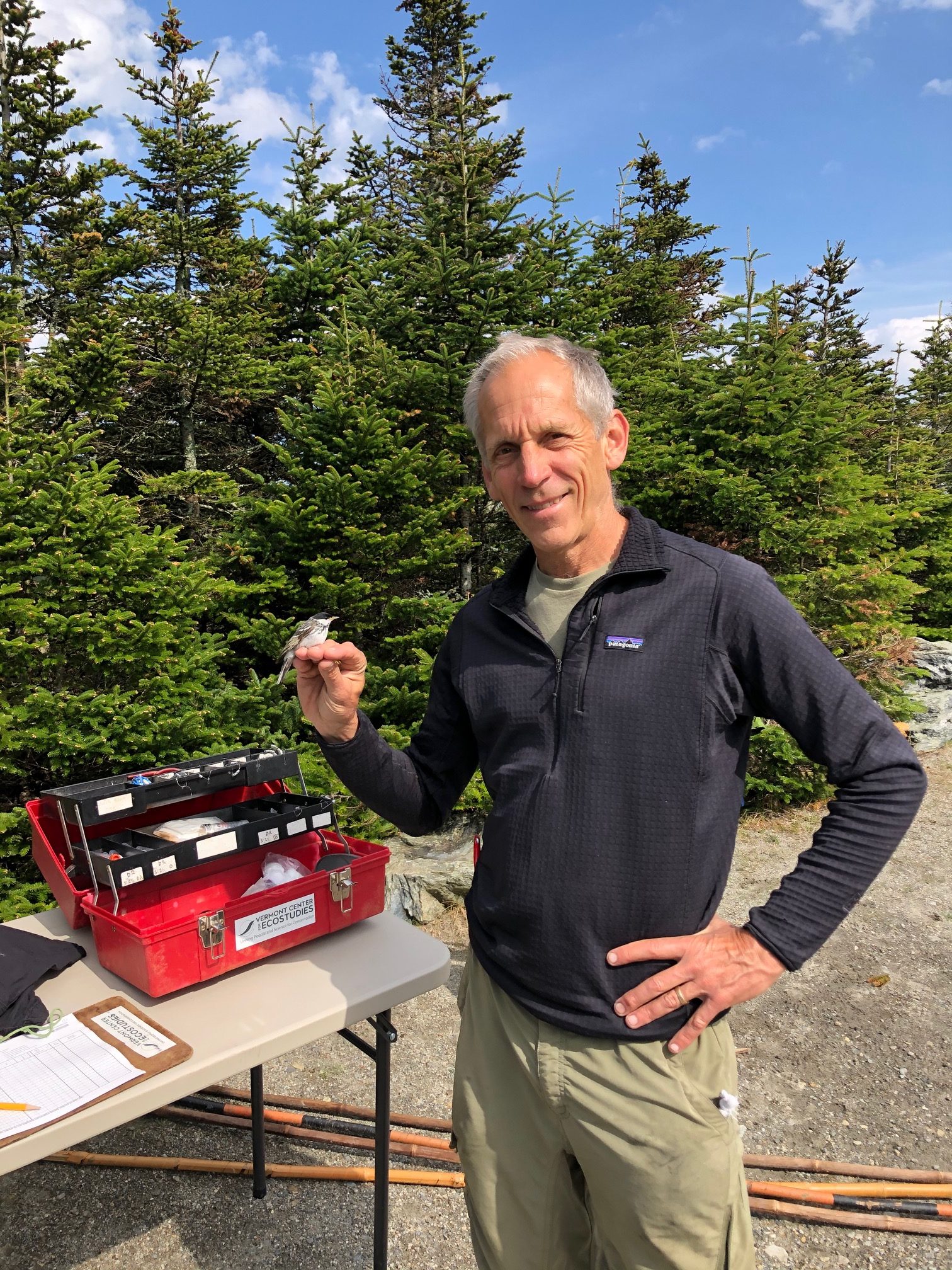 Changed times call for innovative action. We never dreamed of launching VCE’s 29th consecutive field season on Mt. Mansfield via a toll road ascent on motorized ATVs, but it sure beat hiking up with all our gear. Facing the road’s COVID-related closure, with no prospect of an imminent opening, Vermont Fish & Wildlife colleague Noel Dodge and I couldn’t have been more grateful for a mechanized boost from cooperative (and sympathetic) partners Dave Turner at WVNY and Fred Lavenberg at WCAX. We met them at the toll road base during late morning on June 4. Both had hitched small trailers to their ATVs, and we piled in net poles, two trunks of nets and banding gear, a folding table, and our backpacks. Fred then asked, “Which of you is going to drive the third ATV?”. I’ll admit that I was quick to volunteer.