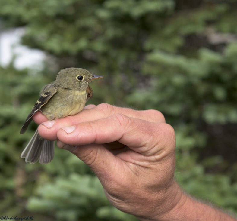 A Yellow-bellied Flycatcher banded on Mt. Mansfield in 2016. This long-distance boreal migrant places its well-concealed nest on the ground under roots of a fallen tree, tucked in a small crevice on a moss-laden rocky ledge, or nestled in moss at the base of a fern. Its “che-lek” song and plaintive whistled “tu-wee” calls are distinctive. © Charles Gangas