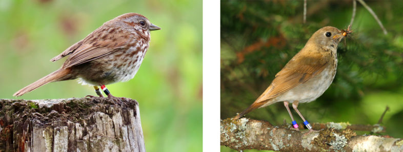 A color-banded adult Song Sparrow (not one of Margaret Morse Nice’s study subjects) and a uniquely color-banded adult Bicknell’s Thrush on Mt. Mansfield. Photos: © Leslie Schweitzer (left), Bryan Pfeiffer (right)