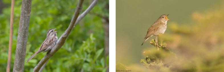 Margaret Morse Nice’s studies of Song Sparrows (left) paved the way for VCE’s research and conservation efforts on Bicknell’s Thrush (right) over 60 years later. Photos © Nathaniel Sharp (left), Charles Gangas (right)