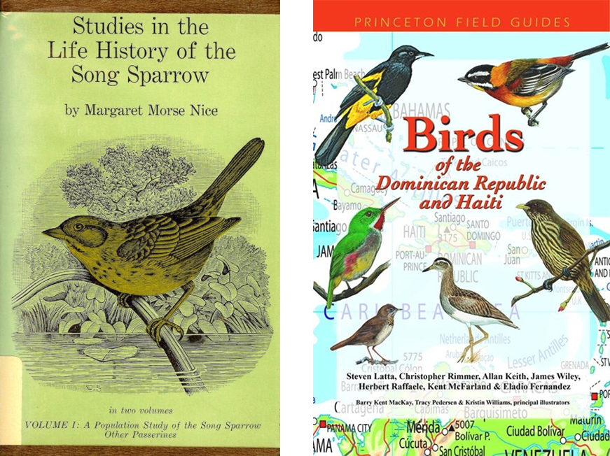 Margaret Morse Nice’s two-volume monograph on Song Sparrow life history, published in 1937 (left) and 1941, remain a benchmark for rigorous, longitudinal avian research. VCE was closely involved in publishing the first-ever field guide to the birds of Hispaniola, with a trilingual (English, Spanish, and French) first edition published in 2006 (right) and a revised second edition in 2022.