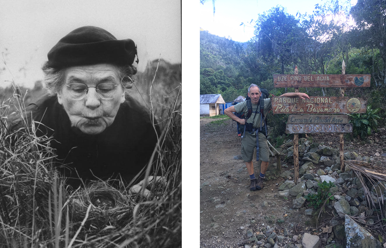 Left: Margaret Morse Nice in her field finery observing a Field Sparrow nest; photo by Al Fenn c.1956. Right: Chris Rimmer at the outset of a backpacking trek into Cuba’s remote Bayamesa mountain range, February 2019.