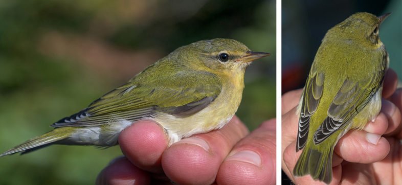 An immature Tennessee Warbler banded on the Mansfield ridgeline, 18 September 2019. Populations of this spruce budworm specialist have increased in the past 2-3 years, tracking a budworm outbreak in Quebec. © Charles Gangas