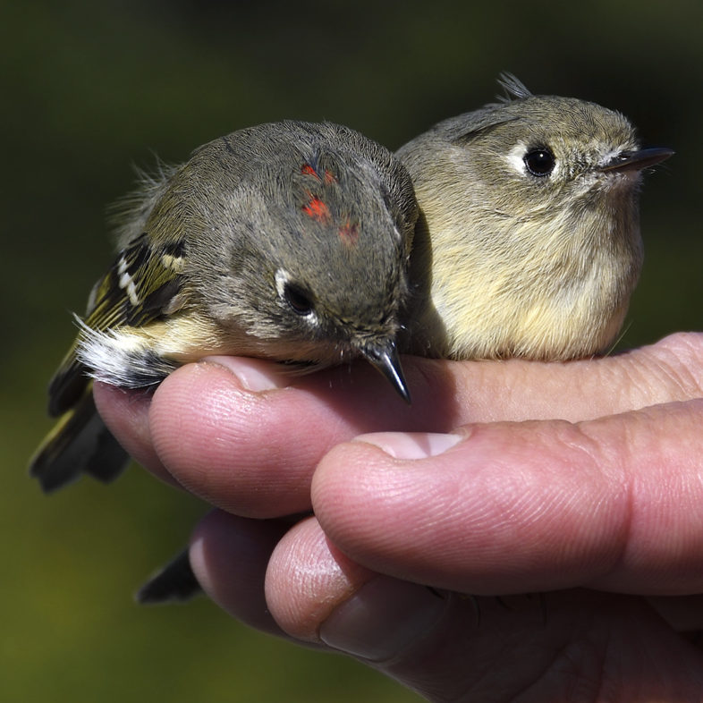 Male (left) and female (right) Ruby-crowned Kinglets—few other species could fit side-by-side in a single bander’s grip. © Michael Sargent
