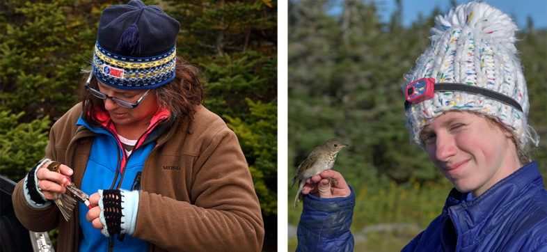 Like mother, like daughter: VCE Associate Director Susan Hindinger bands a Swainson’s Thrush, while her daughter Brooke prepares to release a banded Bicknell’s Thrush. © Michael Sargent (left), Charles Gangas (right)