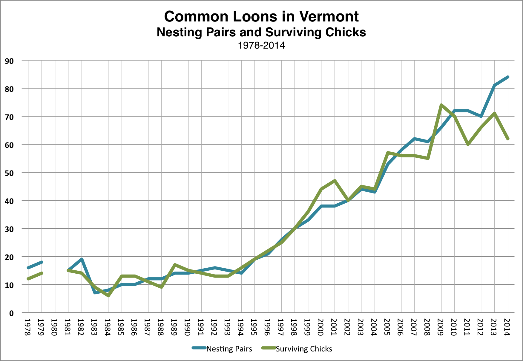 In 1978, with the statewide nesting loon population at alarmingly low levels, the Vermont Fish and Wildlife Department (VFWD) and the Vermont Institute of Natural Science (VINS) implemented a recovery plan for this species.
