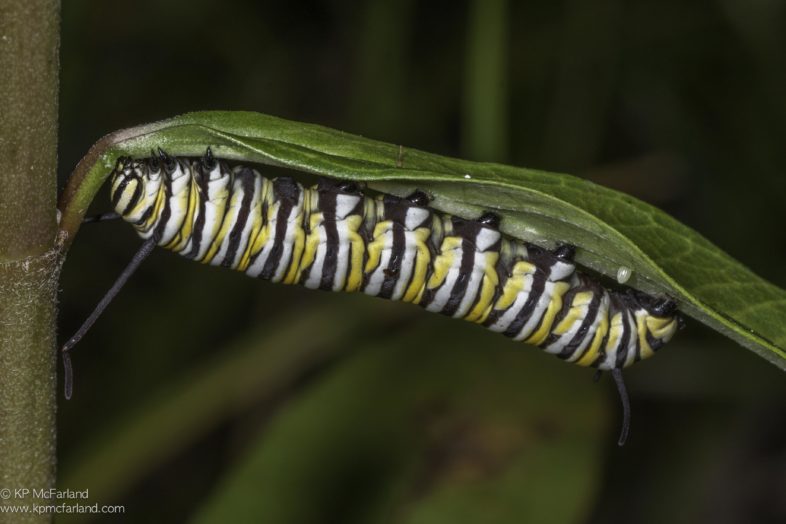 A Monarch caterpillar notches a milkweed leaf to help slow the flow of sap before feeding. An unhatched egg is stuck to the underside of the leaf near the end of the caterpillar. / © K.P. McFarland