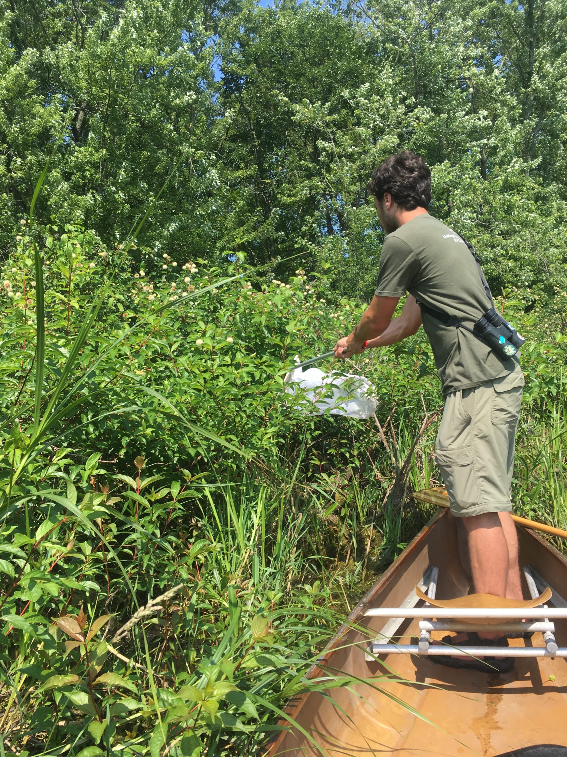 Citizen Science Outreach Naturalist Nathaniel Sharp nets bees on Buttonbush from the bow of a canoe. / © Spencer Hardy