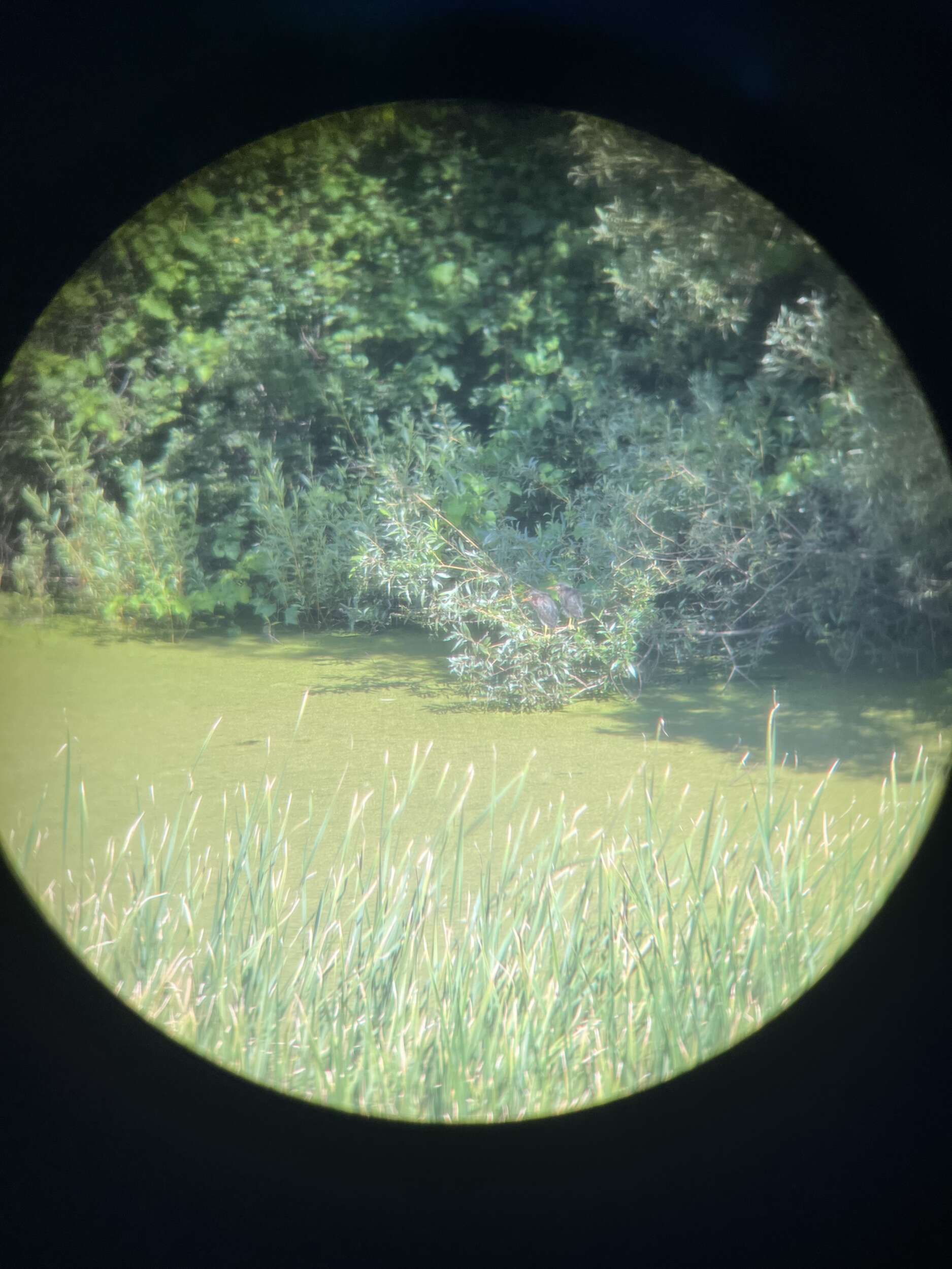 By this point in the internship—with only one week left and all field work done—I had resigned myself to not seeing a Green Heron this summer. However, I was in luck! A flapping commotion on the low-hanging branches above the pond in the office’s backyard drew my attention. Once I got my hands on a pair of binoculars, I was astonished to find not one but three Green Herons! They were distinctly clumsy, wobbling on the branches as they reached down to the water and flapping their wings for balance. That, combined with multiple herons present at once, made me wonder if I was looking at juveniles, but I’m just guessing.