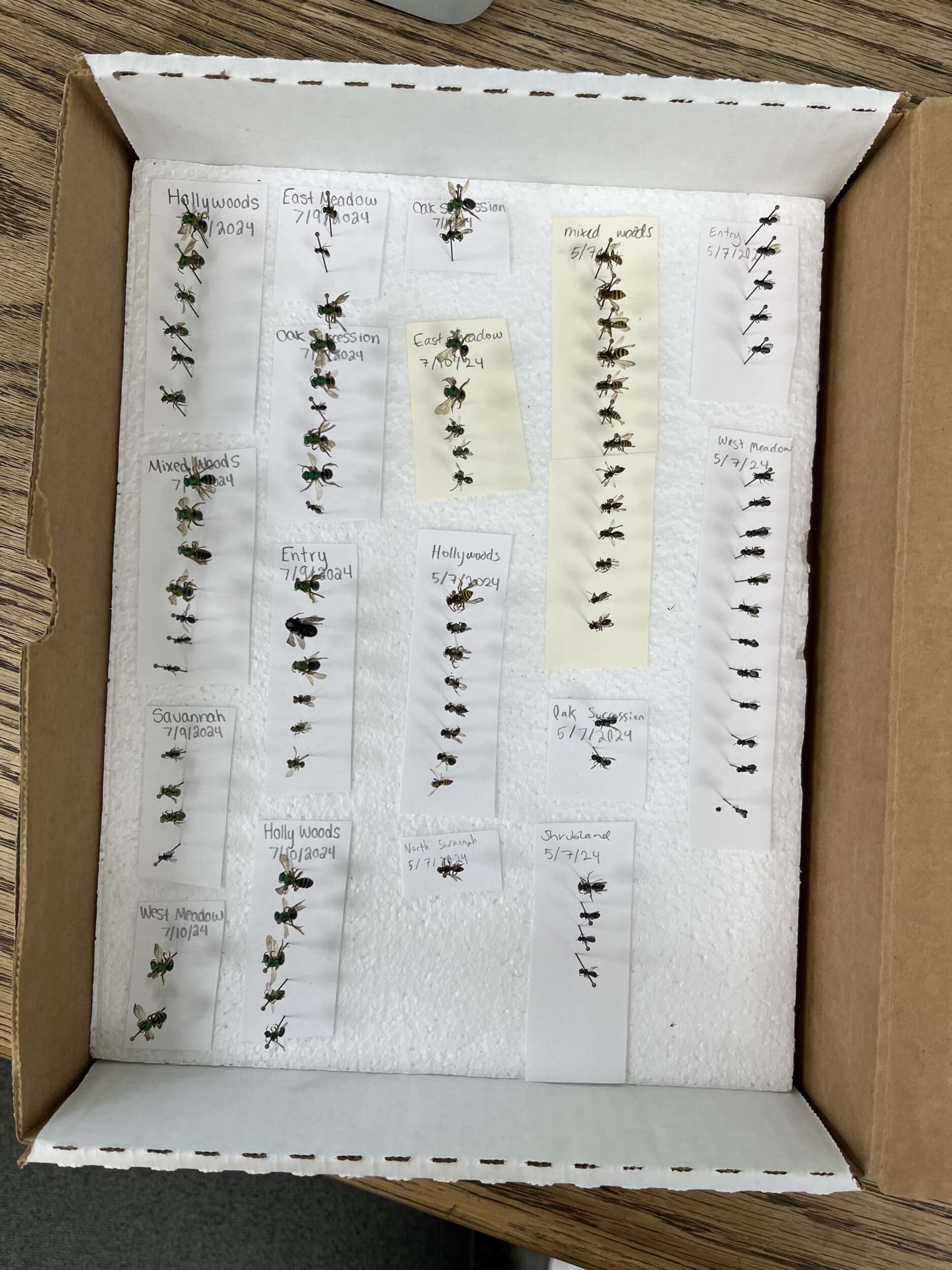 We spent our first full day in the Biodiversity Lab, processing small bees from May collected in Connecticut Audubon’s Smith Richardson Preserve. Bees are far more diverse than I expected, ranging from small, dark Carpenter bees I mistook for flying ants to Cuckoo bees, parasitic bees that I mistook for wasps. The Green Sweat bees were beautiful up close (shockingly iridescent and shiny).