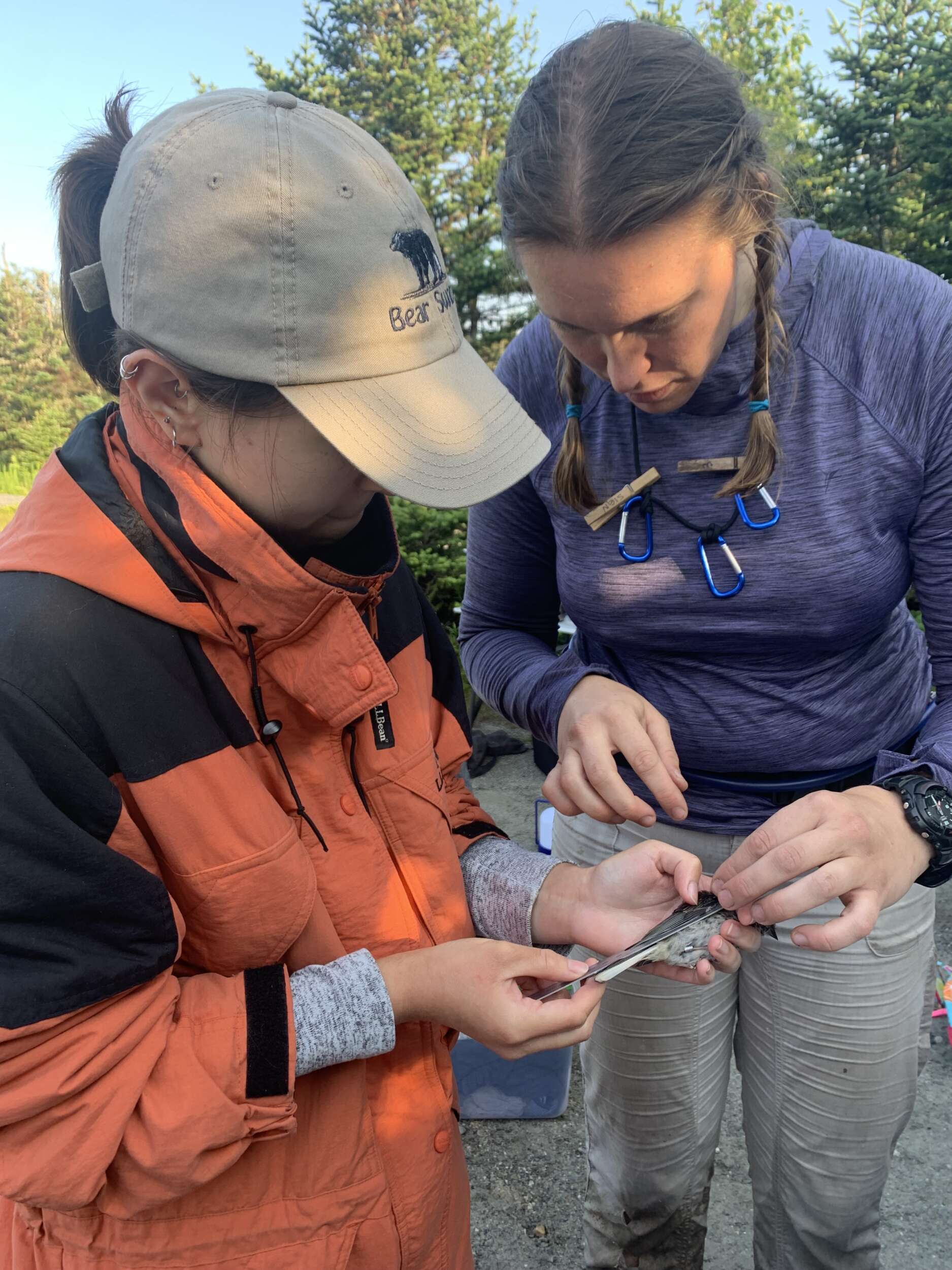 I banded my first bird under the supervision of Anna Peel, VCE’s summer bird banding technician. This little bird was a scruffy juvenile Dark-eyed Junco who stuck around nearby before flying off.