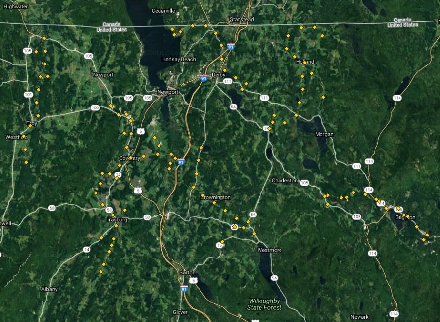 Kathy Wohlfort, a biologist who works with Audubon Vermont, and I set out to explore the Memphremagog area. We traveled roads running through quaint towns, rolling hills, quiet river valleys, and pristine dairy farms, with spruce forests scattered throughout much of the landscape. There was surely potential Whip habitat there: low-elevation river valleys lined with early successional habitat, a matrix of field and pine or spruce forests, and logging areas. We completed six roadside routes on clear, moonlit nights, from Troy eastward to Holland and south to Irasburg. We also surveyed ad hoc points outside each roadside route in areas with potential Whip-poor-will habitat (map below).
