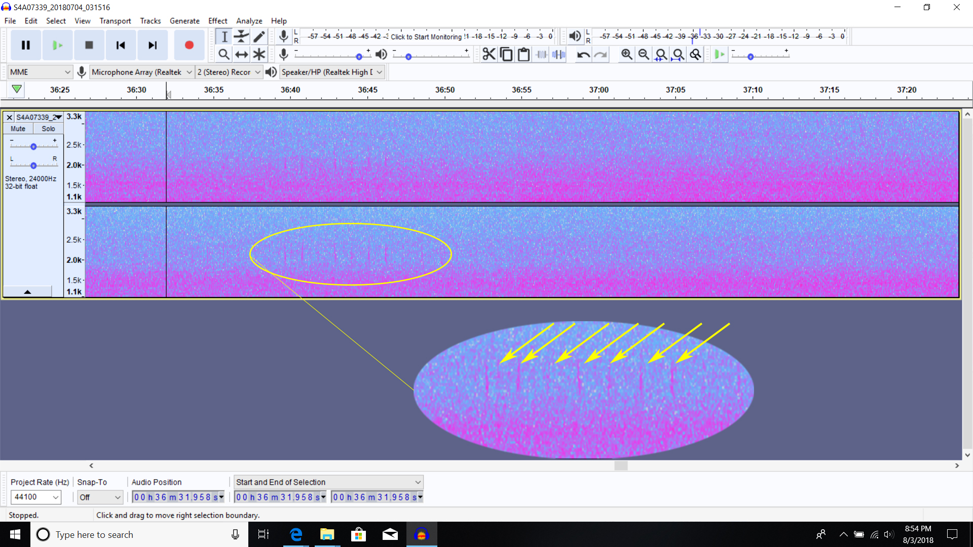 I listened to peepers, peenting American Woodcocks, winnowing Snipes, hooting owls, and calling Black-billed Cuckoos. It was almost like being out in the field, and even those pesky mosquitoes showed up on the spectrogram. Many hours later, I heard a calling Whip-poor-will on a Brighton recording, which was barely recognizable on the spectrogram, proving our method of evaluation—both listening and viewing the spectrogram—to be a good choice.