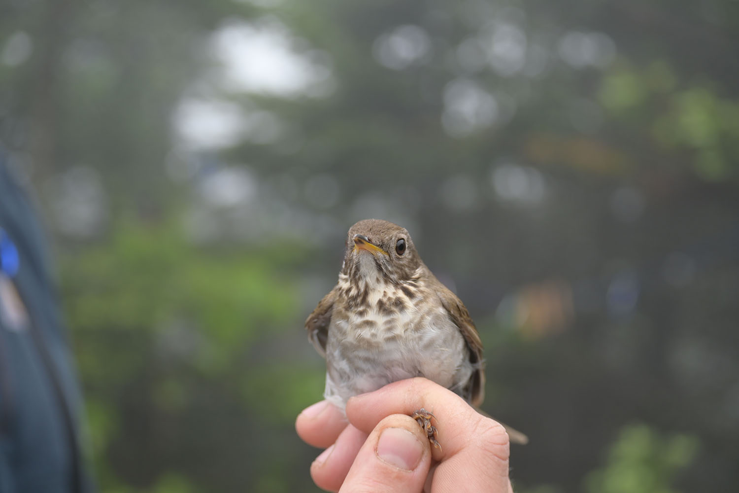 Seasonal VCE Bird Bander Anna Peel shows off a Bicknell’s Thrush she banded in the summer of 2025. © Alden Wicker