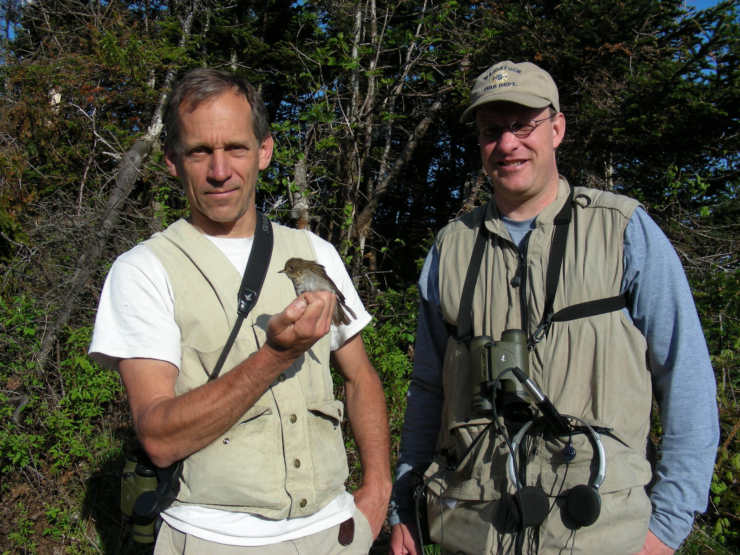 Chris Rimmer holding a Bicknell’s Thrush with Kent McFarland © Kent McFarland