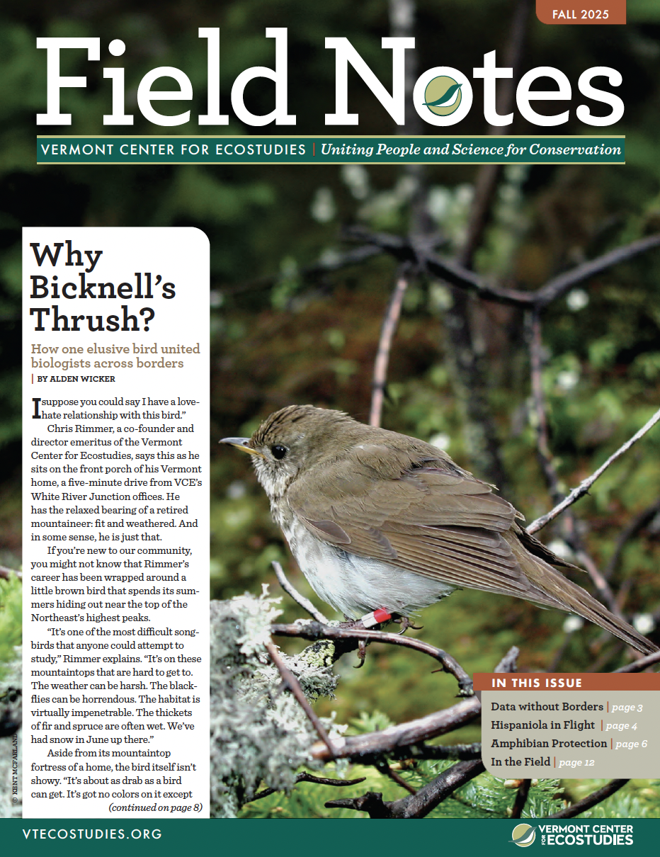 Learn about how VCE's Vermont Atlas of Life is filling critical gaps in biodiversity knowledge, and get the latest updates on our GPS-tagged Bicknell's Thrushes. You can also find a summer loon update and meet some of the newest members of our team. Read Fall Field Notes »