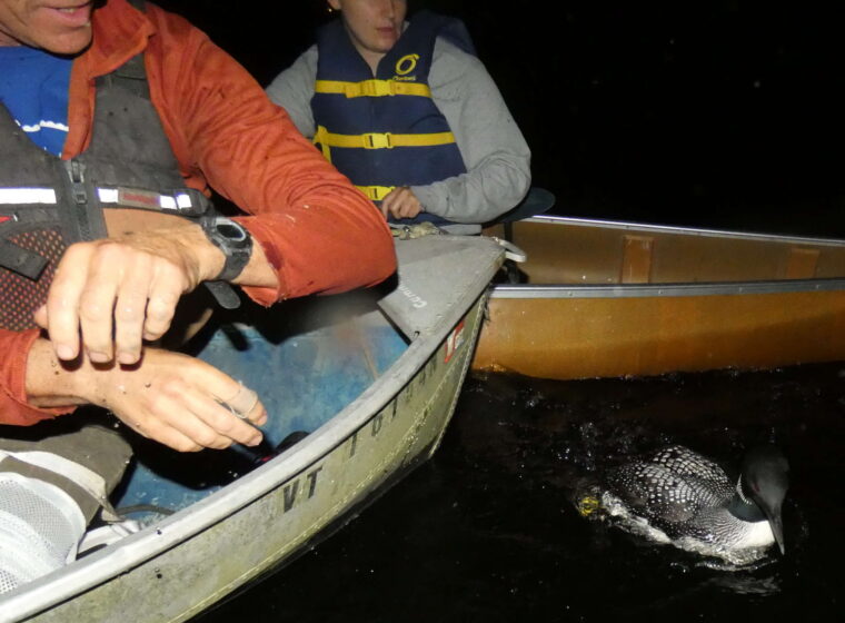 This summer, VCE’s loon conservation team spent two nights attempting (emphasis on attempting) to capture and band loons to learn more about their health and behavior. Despite a few misses, we caught loons on both Holland and Ewell Pond.