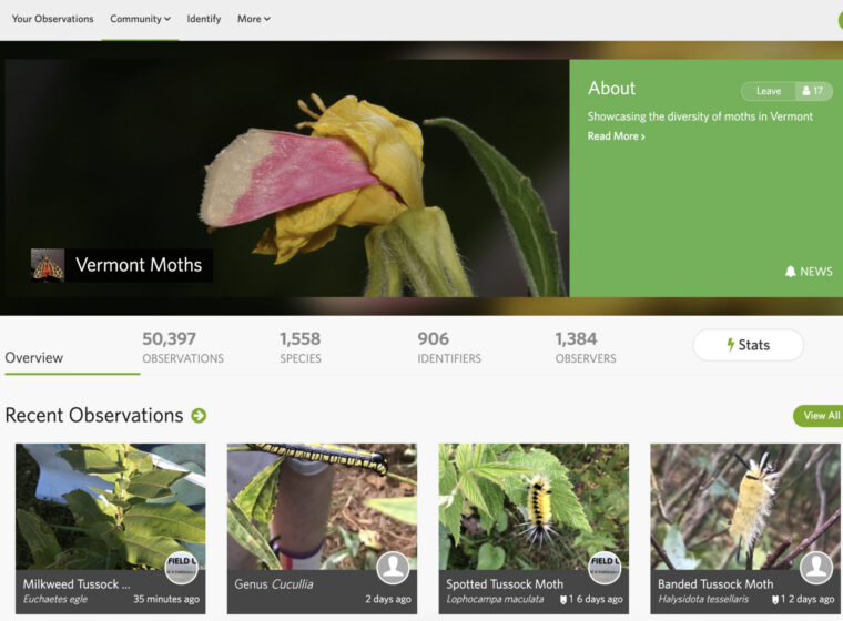 There’s a new collection project that automatically gathers and presents all of Vermont moth data from iNaturalist in one easy place – Vermont Moths on iNaturalist. If you put a moth record in the Vermont Atlas of Life project on iNaturalist, or anywhere in iNaturalist – Vermont Moths will tally it.
