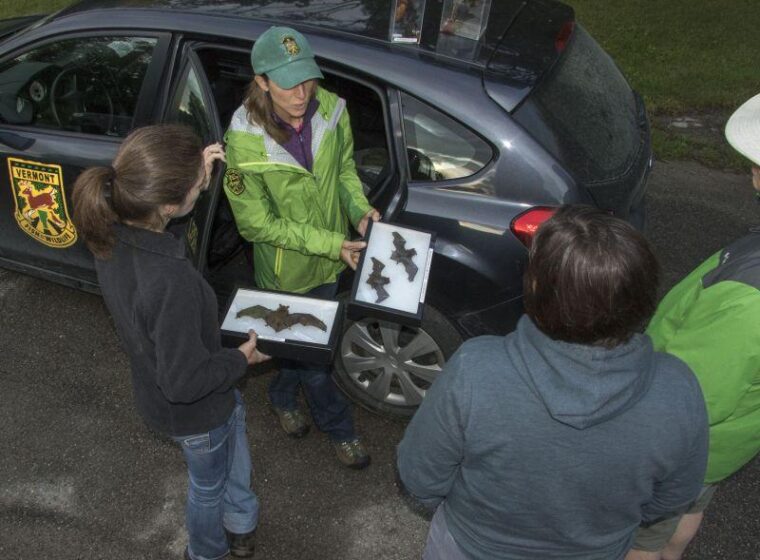 Biologists Kent McFarland and Sara Zahendra join Alyssa Bennett from the Vermont Fish and Wildlife Department, as well as two volunteer bat counters at Bomoseen State Park to count bats as they leave the maternity colony to forage for insects at dusk.