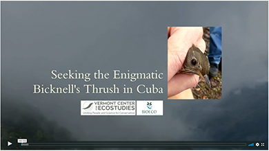 In January 2018, VCE's Chris Rimmer and colleagues from the Cuban science institute BIOECO led a field survey of Bicknell's Thrush on its wintering grounds in the remote mountains of Parque Nacional Pico Turquino in eastern Cuba. Join the crew as they navigate wet, high-elevation trails in search of this avian needle in a haystack. (Length: 12m 19s) Experience the sights and sounds of the Cuban cloud forest »
