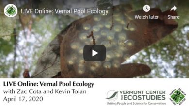 In this webinar, VCE Conservation Biologist Steve Faccio focuses on the ecology of vernal pools with an emphasis on the wildlife (both amphibians and invertebrates) that depend upon them to complete their life cycles. You'll learn about the characteristics of vernal pools and why ecologists consider them to be “keystone ecosystems.” The webinar also feature a demonstration of VCE’s new Vermont Vernal Pool Atlas, an online database and interactive mapping tool for vernal pools in Vermont. (Length: 1h 4m) Watch the recorded webinar »