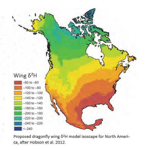Our marker is water, more to the point the two hydrogen atoms in water. Recall from high school chemistry that hydrogen nucleus normally contains a single proton and no neutron. But a tiny fraction of hydrogen atoms around the world carry one proton and one neutron. We call it “heavy hydrogen,” or deuterium. And unlike other such atomic variations among elements (which can be radioactive), deuterium is stable in the environment – a “stable isotope”– and stable in the wing of a dragonfly.