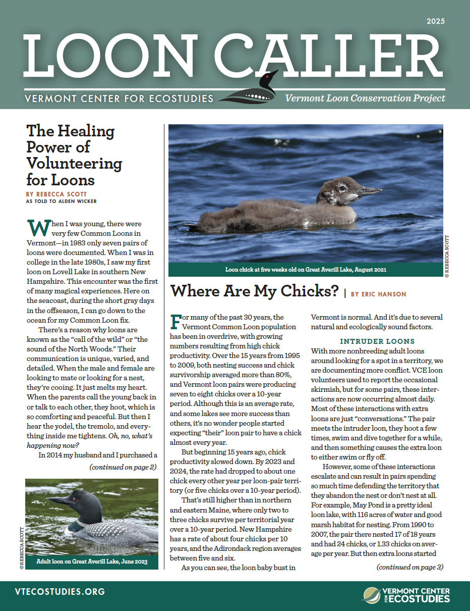 Even more exciting: for the first time, loon chicks hatched out and survived on Shadow Lake in Glover and the Cedar Point territory of Echo Lake in Charleston—both had failed nests in 2024. We documented three new nesting pairs at Colchester Pond, Lake Fairlee, and Long Pond in Milton.