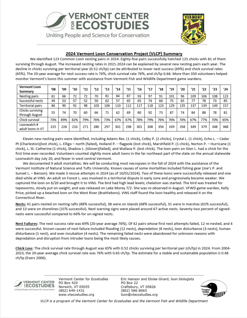 Over 350 volunteers helped the Vermont Loon Conservation Project (VLCP) and the Vermont Fish and Wildlife Department monitor Vermont’s loons this summer, and collectively we identified 115 Common Loon nesting pairs.