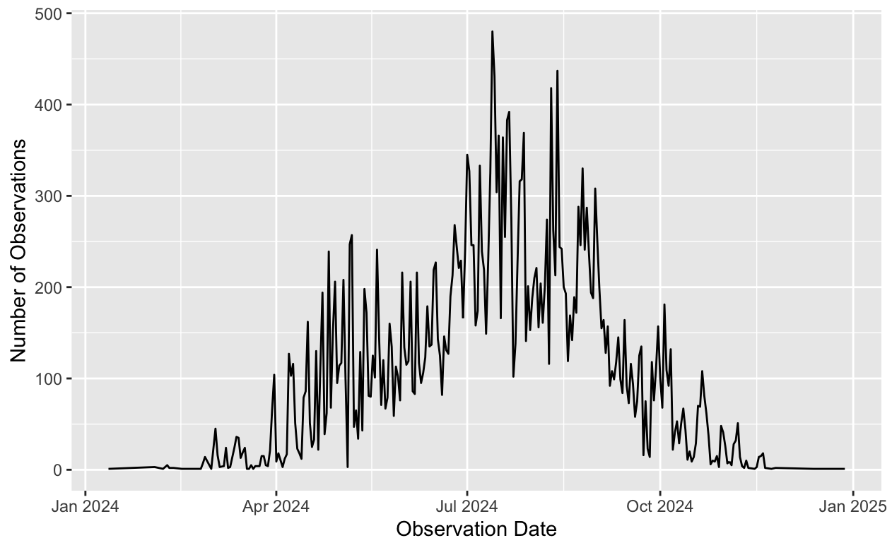 Peak Season: As expected, observations peaked during the warmer months from May to October.