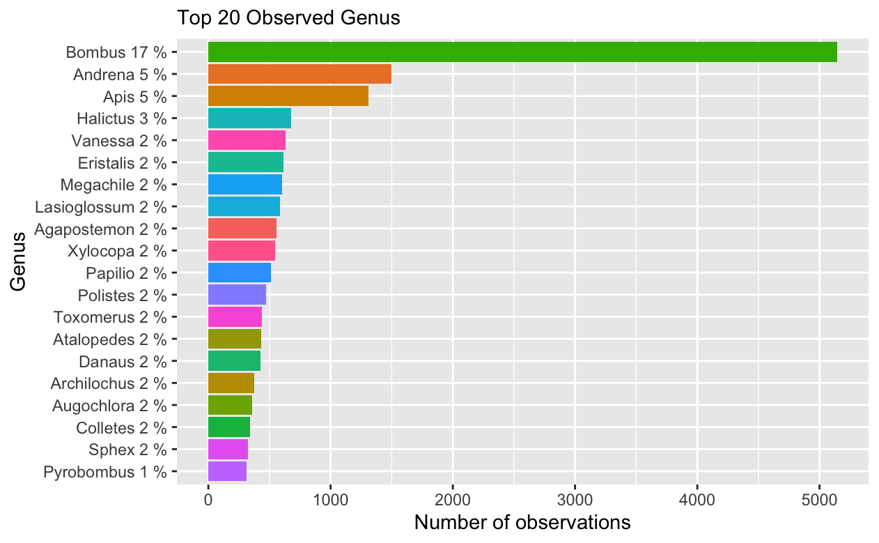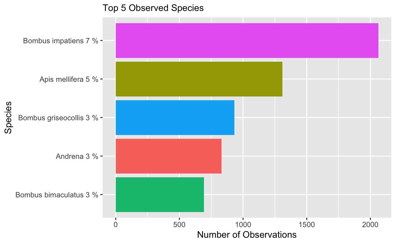 The Bombus genus, specifically the Bombus impatiens (Common Eastern Bumble Bee) reigned supreme with 2,062 observations. Following closely was the Apis mellifera (Western Honey Bee) at 1,309 observations.