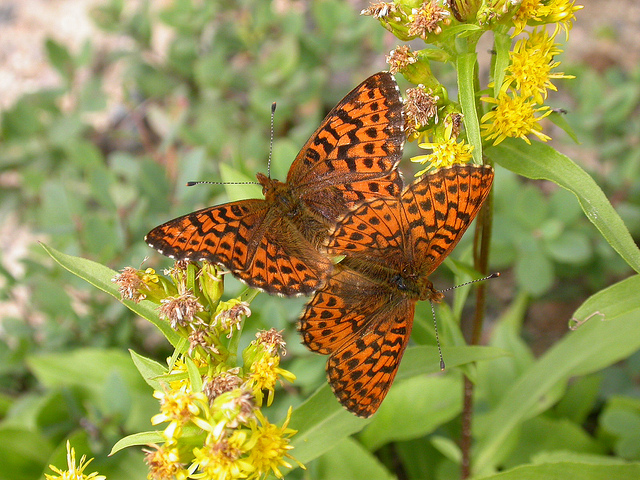 White Mountain Fritillaries fly from late-July until frost in September, mating and nectaring on alpine goldenrod and asters. Caterpillars hatch and begin to mature during the first summer. In their second summer, the caterpillars continue to grow, pupate, and metamorphose into adults (eclose) to start the cycle over again. What plant they feed on as caterpillars is still a mystery, despite more than 100 years of study beginning with the grandfather of New England lepidopterists, Samuel Scudder.